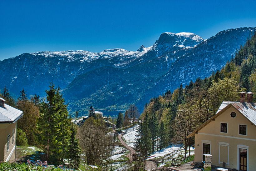 Die "Dammwiese" auf dem Weg zum Salzbergwerk, auf der man die Reste einer prähistorischen Ansiedlung und ein riesiges Gräberfeld entdeckte. "Keltische Bergleute haben in der dünnen Kruste dieser Almwiese ihre Toten und die Zeichen einer mit dem Salzabbau verbundenen Kultur begraben, deren Anfänge sich im Grau der Steinzeit verlieren", schreibt 1999 der oberöstereichische Schriftsteller Christoph Ransmayr. Im Hintergrund die Bergwerksgebäude.