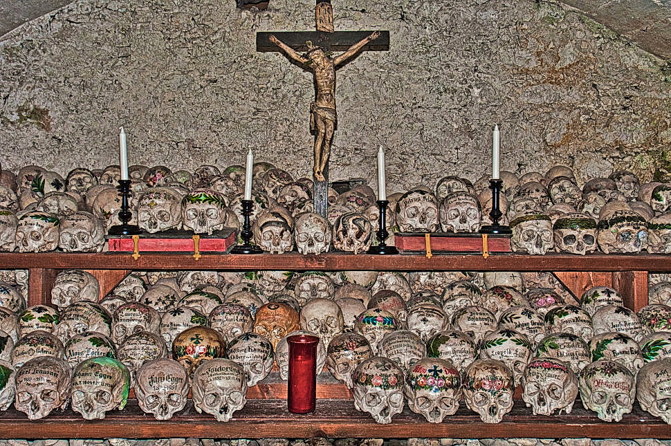 trügerisch sein. Ob sie wirklich die allerletzte ist, entscheidet wegen des notorischen Platzmangels, der auch hier oben herrscht, der Bedarf an neuen Gräbern. War - nach 1600 - ein Grab zehn oder mehr Jahre alt, wurde der Tote exhumiert. Schädel und Gebeine ließ man vom Sonnen- und Mondlicht ausbleichen. Danach wurden sie im Beinhaus der Michaels-Kapelle gleich neben der Pfarrkirche ein zweitesmal beigesetzt. Mit 1200 Totenschädeln - nach Familienzugehörigkeit
