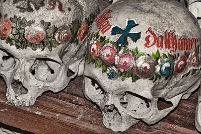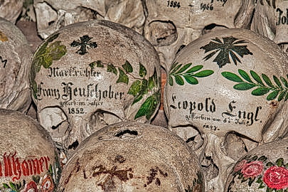 sortiert - birgt der Hallstätter Karner die größte Schädelsammlung, die man je auf der Welt gesehen hat. Mehr als die Hälfte ist kunstvoll bemalt, mit dem Namen des Toten, Geburts- und Sterbedatum und mannigfachen, teils naiv-ornamentalen Hinweisen versehen. Wurde ein Mensch zum Beispiel Opfer einer giftigen Viper, züngelte ein gutes Jahrzehnt später eine ebensolche Schlange von seinem Schädel. Wirkungsvoller könnte man eine Warnung kaum aussprechen...