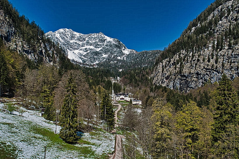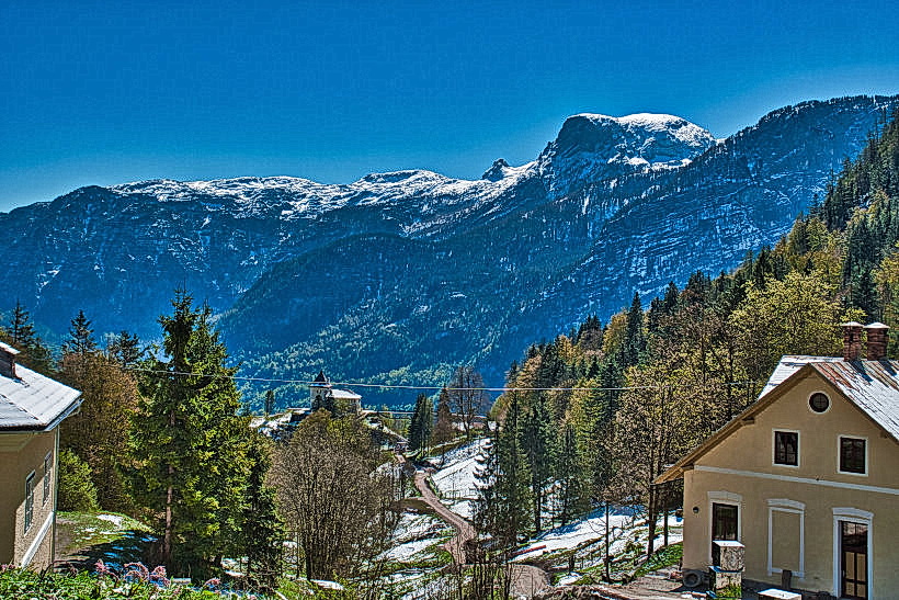 Die "Dammwiese" auf dem Weg zum Salzbergwerk, auf der man die Reste einer prähistorischen Ansiedlung und ein riesiges Gräberfeld entdeckte. "Keltische Bergleute haben in der dünnen Kruste dieser Almwiese ihre Toten und die Zeichen einer mit dem Salzabbau verbundenen Kultur begraben, deren Anfänge sich im Grau der Steinzeit verlieren", schreibt 1999 der oberöstereichische Schriftsteller Christoph Ransmayr. Im Hintergrund die Bergwerksgebäude.