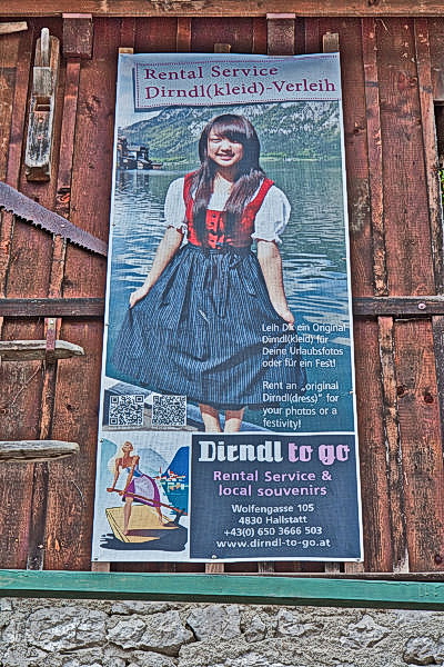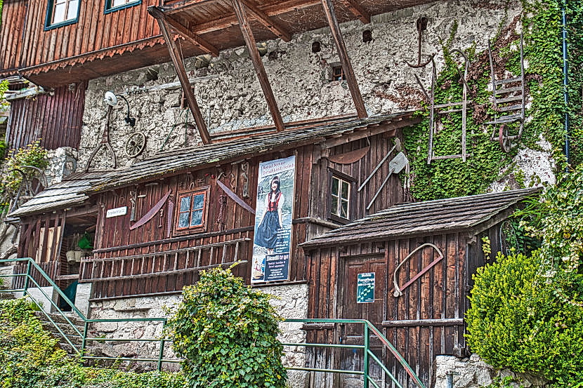 Angesichts so vieler Schaufeln, Sägen, bei so viel rollendem Gerät an der Außenhaut des Hauses: vielleicht ein extrovertiertes Handwerker- oder Bauernmuseum? Es ist nicht nur die kühne Steilheit von üppig bewachsenen Hängen und häuslichen Fassaden, die in Hallstatts Seestraße bewundernde Aufmerksamkeit einzufordern weiß - allüberall lauern ganz verblüffende Details, die die Sinne mobilisieren. Zum Beispiel das fesche "Dirndl to go", das freundlich um Leihnahme