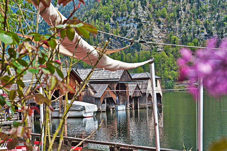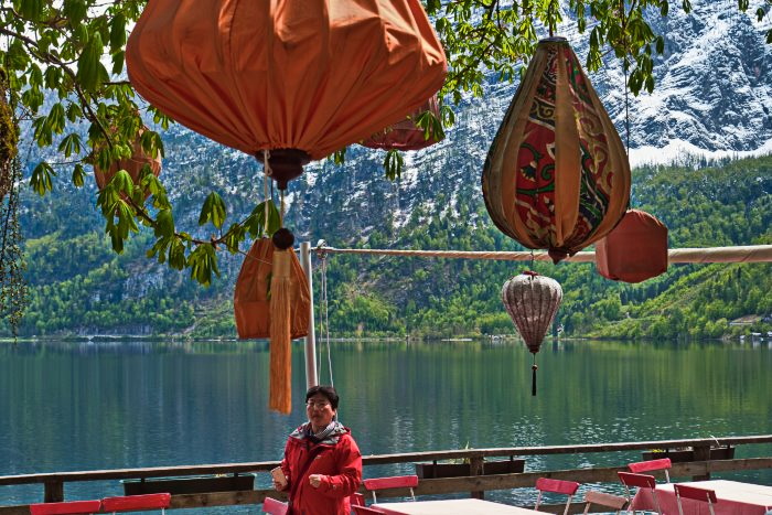 In einer Zeit, da sich anderswo die eher entmutigende Diskussion darüber, was zu diesem oder jenem gehöre, im Vagen dahinquält, lassen die Hallstätter original-chinesische Lampions über Biergartentischen baumeln, wohl zum Zeichen, dass's "scho passt". Die Farben passen - zur stillen Freude des Fotografen - allemal...