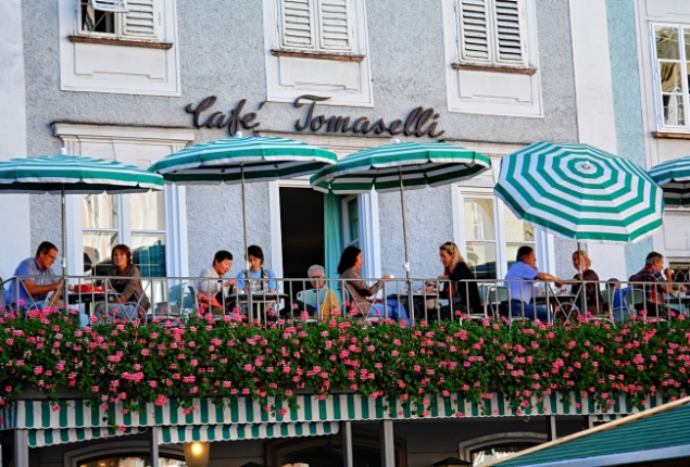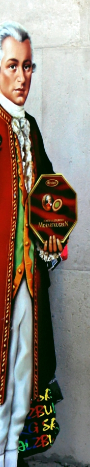 Unten rechts: Hermann Bahr, Hugo von Hofmannsthal und Max Reinhardt sollen in diesem ältesten Caféhaus Österreichs die Idee zu den Salzburger Festspielen geboren haben. Darunter: Blick auf den Alten Markt. Ganz links noch einmal das Café Tomaselli; unmittelbar daneben, mit nur 1,42 Metern Breite, das kleinste Altstadthaus Salzburgs. Der Alte Markt, bereits im 13. Jahrhundert als Markt- und Handelsplatz angelegt, wird von stattlichen Bürgerhäusern umrahmt. In seiner Mitte der Florianibrunnen. Unten links: Wer gern Mozartkugeln im Mund zerschmelzen lässt, ahnt wohl nichts von dem Streit, wer denn der eigentliche Erfinder dieser Köstlichkeit sei. Mozart jedenfalls lebte hundert Jahre zu früh, als dass er selbst es hätte sein können. Der Salzburger Konditor Paul Fürst kreierte sie 1890 zunächst als "Mozart-Bonbons", und im Café Fürst kann man sicher sein, die einzig echten Mozartkugeln zu erwerben. Wer will sich da schon, auch wenn Mozart höchst persönlich sie anbietet, mit einem Nachahmer-Produkt zufrieden geben... |