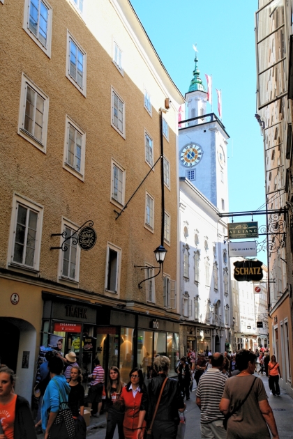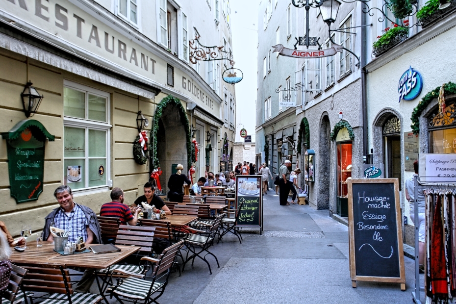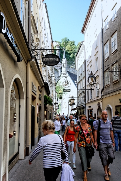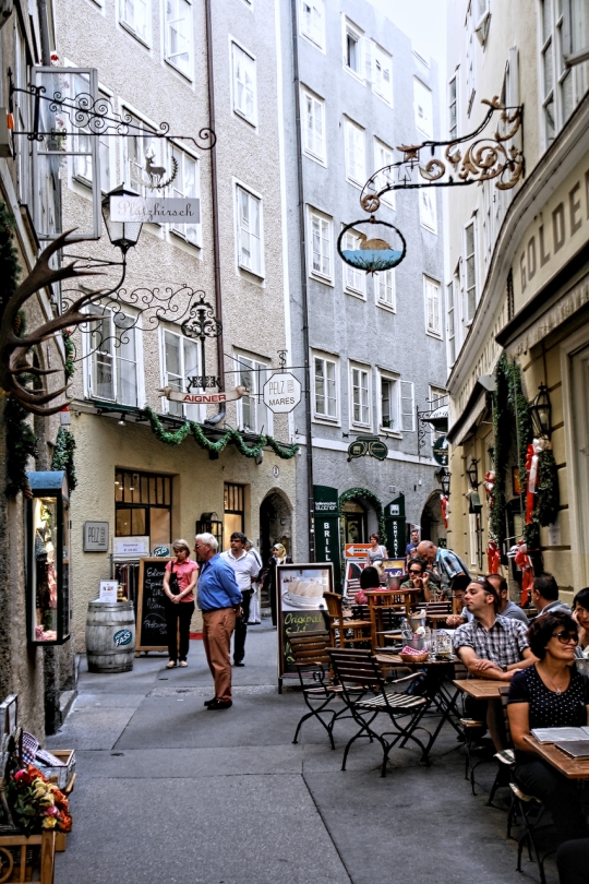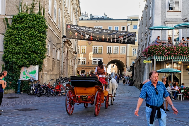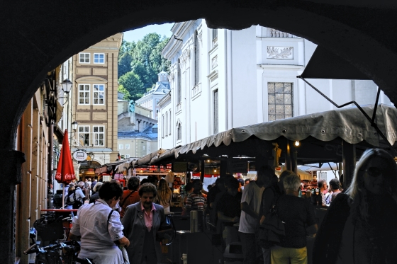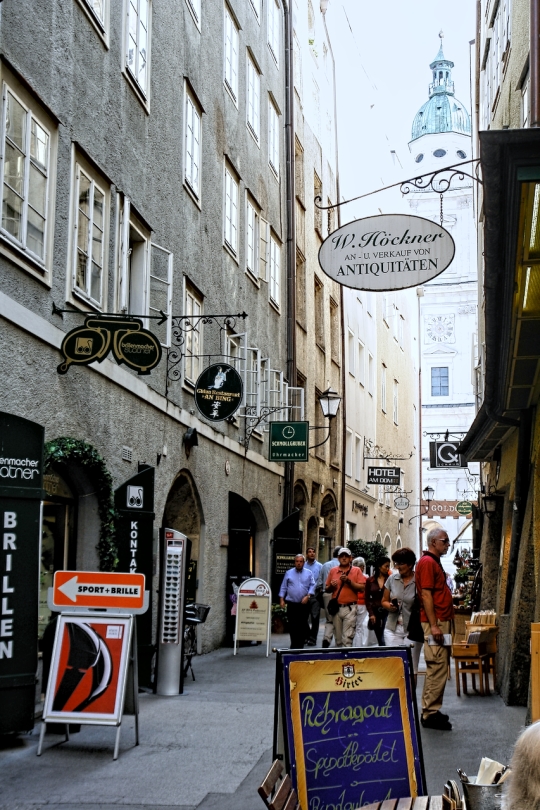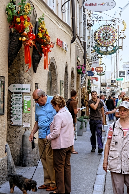 Vom Makartsteg über die Griesgasse, durch die Sterngasse zur Getreidegasse: Ein paar hundert Meter nur, und wir stehen in der Altstadt links der Salzach. Fast zum Greifen nahe jetzt die vielen Türme und Kuppeln, die in der Neustadt noch aus respektvoller Weite herüberwinkten. Wie wohltuend, die Sinne auf das viele schöne Andere konzentrieren zu dürfen und nicht auf Motorverkehr: Die Salzburger Altstadt ist, "verkehrsberuhigt", zu einem Dorado für alles Fußläufige erhoben worden - auch für die liebenswerten Fiaker, die hin und wieder den Weg kreuzen und in lässigem Tempo an uns vorbei über die Kopfsteine klappern. In vergangenen Zeiten, da noch das eine oder andere Ross, die Nerven verlierend, samt schepperndem Gespann und überfordertem Kutscher durch die engen und durchaus nicht menschenleeren Gassen schoss, wird es ungleich gefährlicher gewesen sein als im Salzburg dieser Tage. Salzburgs Gassen. Dem Besucher fällt auf, wie zahlreich sie sind und dass man sie - man muss nur genauer hinschaun - kaum miteinander verwechseln kann. Gassen mit "Alleinstellungsmerkmal" also. Eines haben sie jedoch gemein: die kleinen Geschäfte, die Trachten, Hüte, Feinkost, Schmuck, Mode, Lederwaren, Pelze, Antiquitäten, Bücher und tausend andere Köstlichkeiten feilbieten. Je kleiner, je feiner! Überall dominieren schmale, aber bewundernswerte, mit bunten Zunftschildern verzierte Fassaden. Dazu die "Durchhäuser" mit ihren Innenhöfen und ebenso überraschenden wie facettenreichen Durchgängen zu Plätzen und anderen Gassen. Wer - wie wir, die wir jetzt in der Getreidegasse auf und ab spazieren - ihren Namen mit irgendetwas Pflanzlichem assoziiert, muss alsbald einen Irrtum eingestehen: Ursprünglich hieß sie "Travgasse" (von trav = Trab!) und wurde über "Traidgasse" schließlich zur "Getreidegasse". Also nicht wirklich Getreide! Womit wir - Trab! - wieder bei den Pferden wären. Heute sind es eher Touristen, die durch die Getreidegasse traben. Übrigens: alles hier scheint mit allem auf übersichtlichem Raum verwoben zu sein: Getreidegasse, Haffner-Gasse, Franziskanergasse, Goldgasse, Judengasse, Brodgasse, und immer wieder findet man sich wie auf wundersame Weise am Alten Markt wieder, der schon im 13. Jahrhundert Mittelpunkt städtischer Betriebsamkeit war. |
