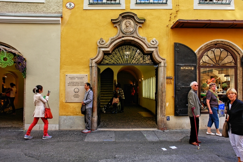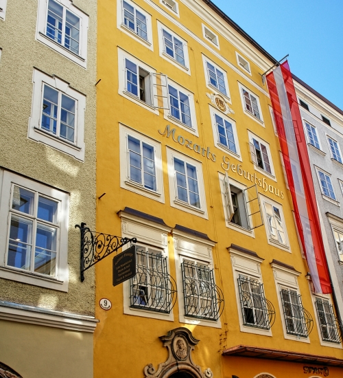 Die Getreidegasse liefert immer wieder neue Impressionen. Oben links: die Gasse mit Blick in Richtung Westen. Im Hintergrund die St. Blasius- oder Bürgerspitalkirche von 1330 vor dem Mönchsberg. Oben Mitte: Wogende Geschäftigkeit überall - unter einem Meer von Zunftzeichen. Oben rechts: Die Gasse in östlicher Richtung. Ganz nah der Turm des Rathauses, ursprünglich aus dem 14. Jahrhundert, mit seinem filigranen sechskantigen Glockenaufsatz. Mit den Turmglocken läutete man einst die Nachtruhe ein. Bilder unten: In diesem Haus, dem sogenannten Hagenauerhaus, in der Getreidegasse 9 kam Wolfgang Amadeus Mozart am 27. Januar 1756 zur Welt. Heute beherbergt es ein sehenswertes Museum, das nicht nur Einblicke in das Leben des großen Musikers, sondern allgemein in das Salzburg des 18. Jahrhunderts gewährt. |