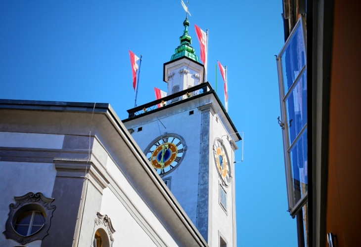 Links: Das Salzburger Rathaus, im Mittelalter Wohnsitz einer Patrizierfamilie namens "Kheuzl" (deshalb auch "Kheuzl-Turm"), wurde ab 1407 als Rathaus genutzt. 1616-18 fand eine barocke Umgestaltung statt; die heutige Rokoko-Fassade enstand erst 1772-75. Dem auffällig zierlichen Glockenturmaufbau lagen italienische Vorbilder zugrunde. |
