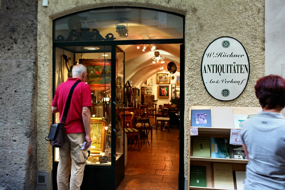 Unten: Vor den Schaufenstern Salzburger Antiquitätengeschäfte und Antiquariate - und erst recht drinnen! - könnte man stundenlang auf Entdeckungsreise gehen. Wer hier ein Souvenir - oder mehr als das - sucht, wird auf beglückende Weise fündig werden. Etwas Kleingeld vorausgesetzt. |