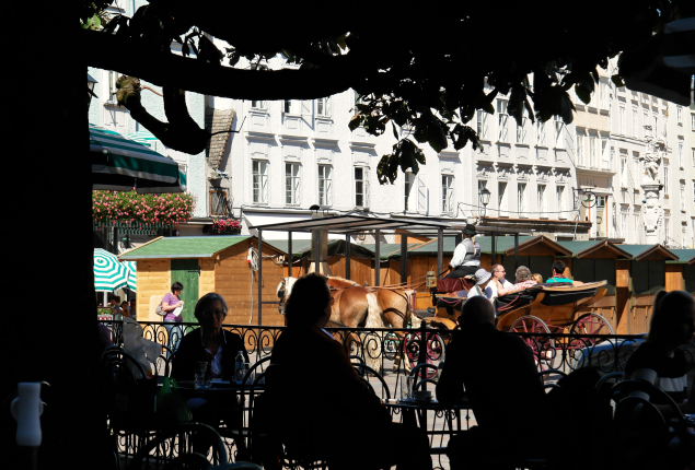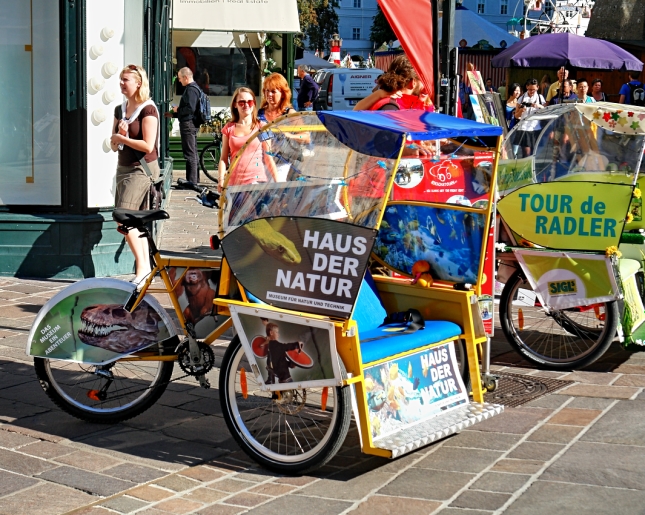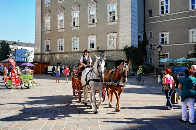 Am Alten Markt Links: Fiaker an der Südöffnung des Alten Markts. Ganz im Hintergrund ist der Residenzplatz (mit Riesenrad) zu sehen, vorn die dem Alten Markt zugewandte Fassade der Alten Residenz. Links unten: Blick auf die Churfürststraße in Richtung Sigmund-Haffner-Gasse. An der Ecke das berühmte Café Tomaselli. Unten: Die dritte Fortbewegungsart für Fußgänger in der Altstadt - neben einfach mal lässig Dahinschlendern und kräftesparend Fiaker-Fahren: Salzburg erobern mit der Fahrrad-Rikscha. |
