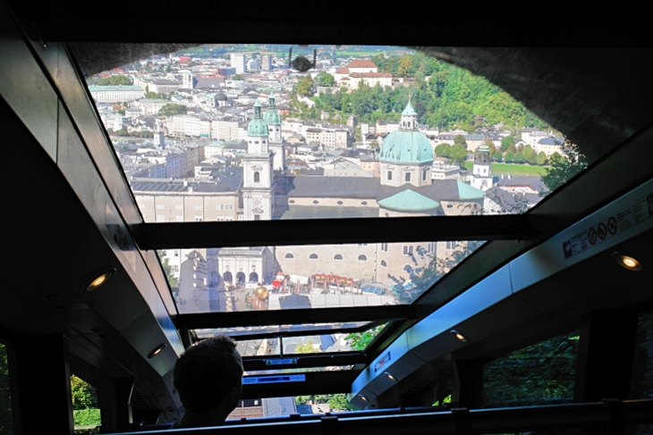 Ein halber Tag vergangen, da stellt sich Lust nach Höherem ein - und auf ein Bier nebst Imbiss bei Stiegl in der Festungsgasse. Das Höhere, die Festung Hohensalzburg, erreichen wir dann, um Zeit und Füße zu schonen, mit der Festungsbahn, die uns schon einmal einen Vorgeschmack auf das gewährt, was sich von oben offenbart (Bild unten). |