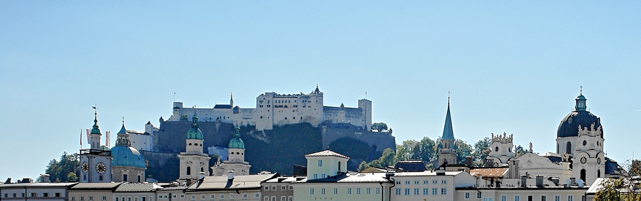 Zur besseren Orientierung noch einmal die Hohensalzburg, wie sie sich von der nördlich vorgelagerten Altstadt her darbietet. Von links nach rechts (Ost nach West): Die (etwas tiefer gelegene) von 1524 bis 1526 erbaute Nonnbergbastei mit Bürgermeisterturm, die Kuenburgbastei von 1681 mit dem mittelalterlichen Trompeterturm, dahinter hervorlugend der Turm der St. Georgskirche, anschließend der Hohe Stock mit dem Glockenturm (ursprünglich von 1465) und am westlichen Ende die obere und die untere Hasengrabenbastei, die 1634 Fürsterzbischof Paris von Lodron errichtete. |