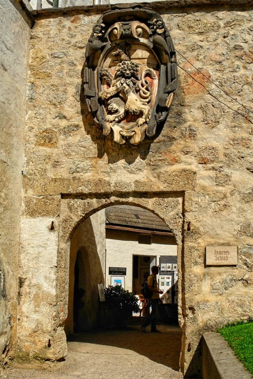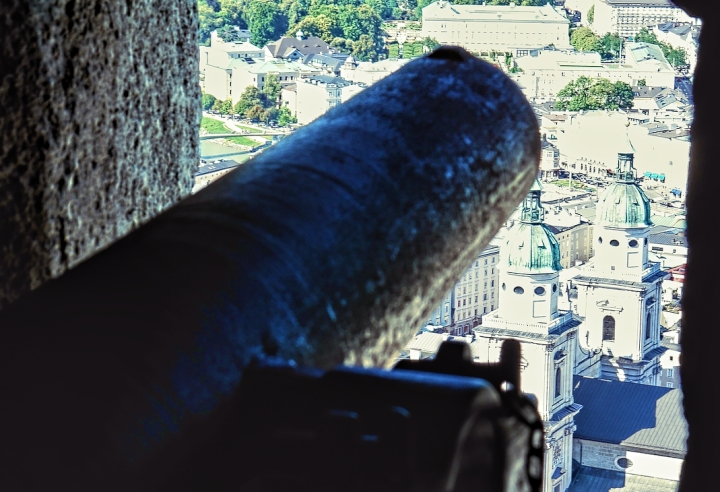Links: Tor in der Trennmauer zwischen Hasengrabenbastei und Hohem Stock. Unübersehbar wie Achtung gebietend das Wappen des Fürsterzbischofs Paris von Lodron über dem Tor. Oben: Kanonen gegen die Stadt? Ausdruck des Verteidigungswillens der Fürsterzbischöfe zu allen Zeiten ihrer oftmals bedrohten Herrschaft. Wer wohl wen mehr bedrohte... |