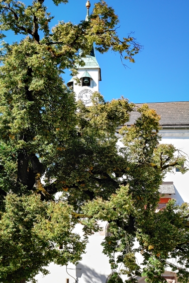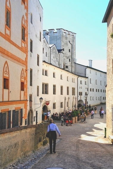 Links: Im Innenhof der Burg die von Leonhard von Keutschach um 1502 erbaute St. Georgskirche mit ihrem auffällig zierlich-spitzen Uhr- und Glockentürmchen. Rechts: Am Schüttkasten vorbei führt der Weg zum Südteil der Befestigungsanlage. Blick auf das bereits im 15. Jahrhundert begonnene, später aufgestockte Arbeitshaus mit dem Geyerturm. Er ist neben Glockenturm, Trompeterturm und Hasenturm einer der vier mittelalterlichen Türme der Feste. Unten: Ein paar Schritte näher am Arbeitshaus mit Burgschenke und Geyerturm. Rechter Hand liegt der Kuchlturm. |
