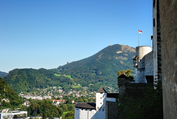 Schöne Aussichten! Oben links: Blick in nördlicher Richtung über die Nonnbergbastei hinweg zum 1.278 Meter hohen Gaisberg des Salzburger Voralpenlandes. Oben rechts: Von der Hasengrabenbastei schweift der Blick in Richtung Süden. Im Mittagsdunst des Tages erscheint der Untersberg mit seinen fast 2.000 Metern Höhe, ein Teil der Berchtesgadener Alpen. Unten: Die Salzburger Altstadt, von der Kuenburgbastei aus gesehen. Links unten im Bild die Stiftskirche St. Peter; darüber mit bräunlichem Dach die Franziskanerkirche und wiederum dahinter die Kollegienkirche. Rechts der romanische Dom mit Domplatz. |